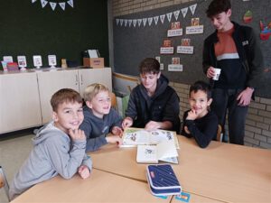 Die Neuntklässler waren mit ihrem Deutschlehrer Herr Kron, dem Schulleiter der Realschule, zuvor in der Stadtbücherei Markgröningen, um geeignete Vorlesebücher auszusuchen. Beratend unterstützt wurden sie dort von Frau Melinosse.